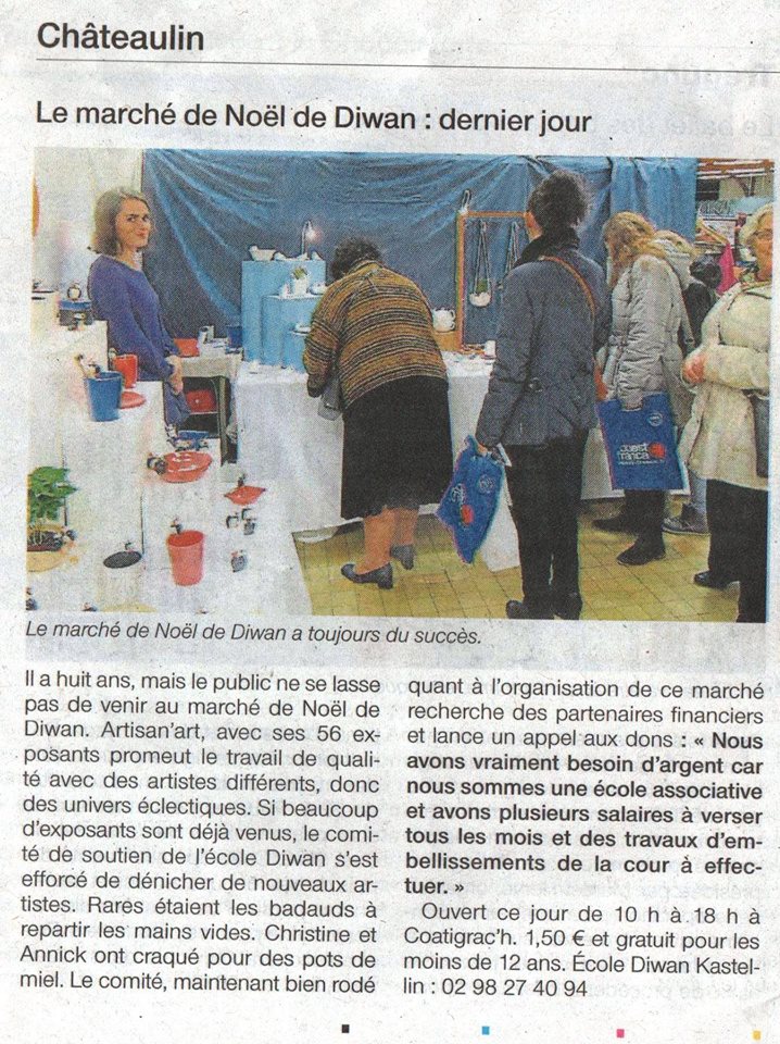 Moineaux & Co était présent lors du marché de Noël de Châteaulin organisé par l’école Diwan. Un chouette évènement plein de bonne humeur ! La photographe du Télégramme a saisi le moment 🙂 Merci !