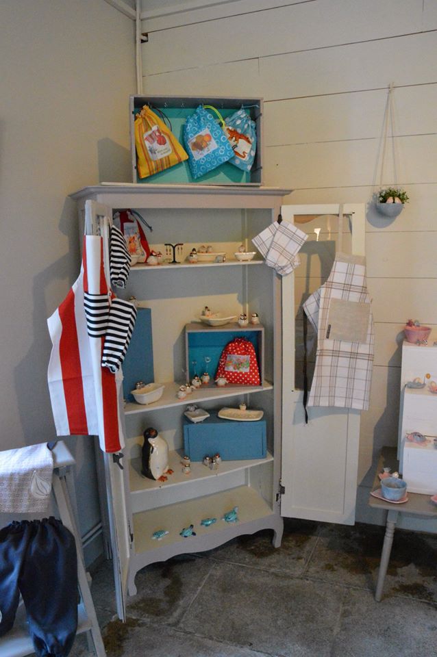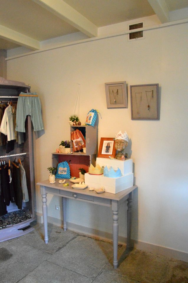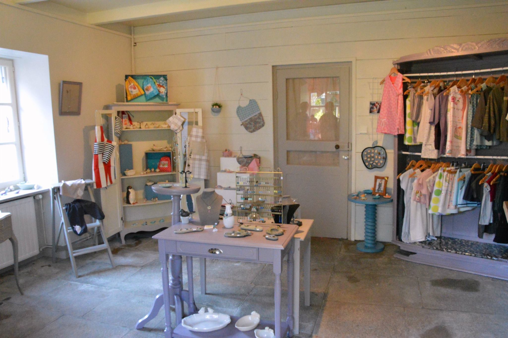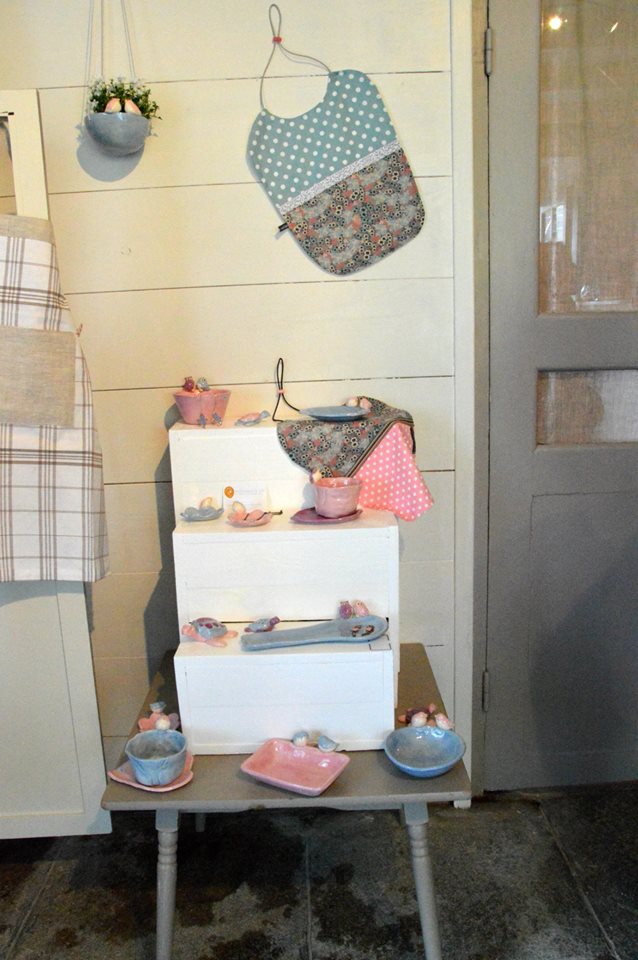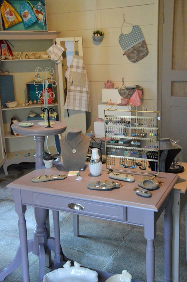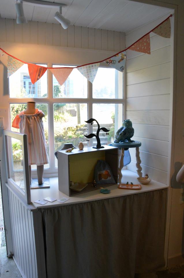 Boutique de trois créatrices finistériennes : Graine de Caillou (textile), La Pointe du Vent (bijoux), Moineaux & Co (céramique).
