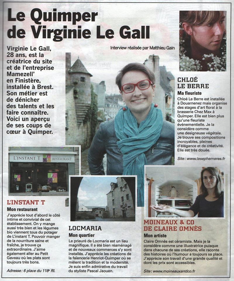 Merci à Virginie pour l’article « Le Quimper de Virginie Le Gall » du journal hebdomadaire Côté Quimper !