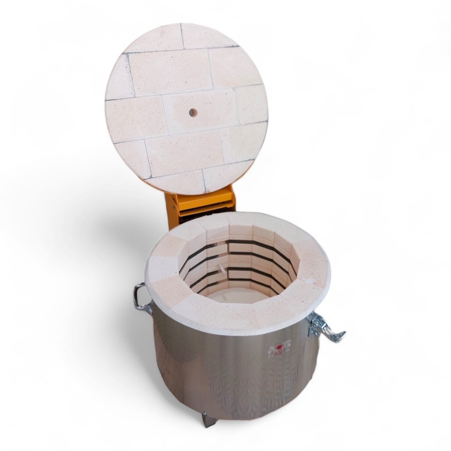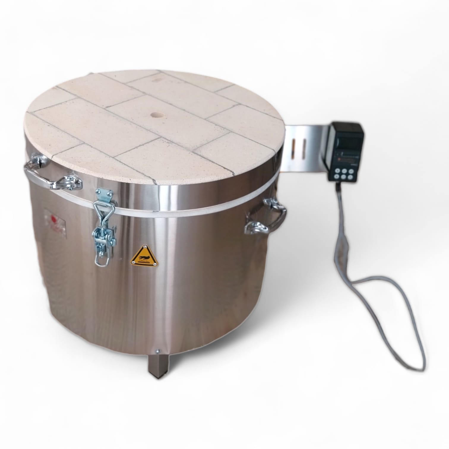 Isolation intérieure briques + fibre contre la paroi inox. Double isolation : briques réfractaires 70 mm + 20 mm de Board entre la brique et l’inox. Carcasse en inox, avec poignées pour soulèvement et orifice dans le couvercle pour évacuer la vapeur d’eau. Le four est équipé de la régulation électronique ATR-902 débrochable, avec mise en route différée, 15 courbes programmables de 20 segments chacune. Affichage constant de la température et du programme, remise en route automatique en cas de coupure de courant, et contrôle des résistances. Système de sécurité par coupure d’alimentation électrique en cas de dépassement de la température maxi. Le Pluton 0S a des pieds solidaires et non équipés de roulette.