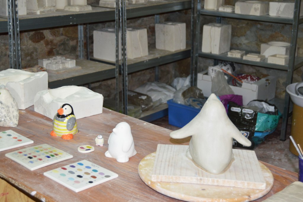 Quelques étapes qui montrent la réalisation des pièces : modelage / moulage / séchage / cuisson du biscuit / peinture / émaillage / cuisson / sortie du four, la céramique est prête !