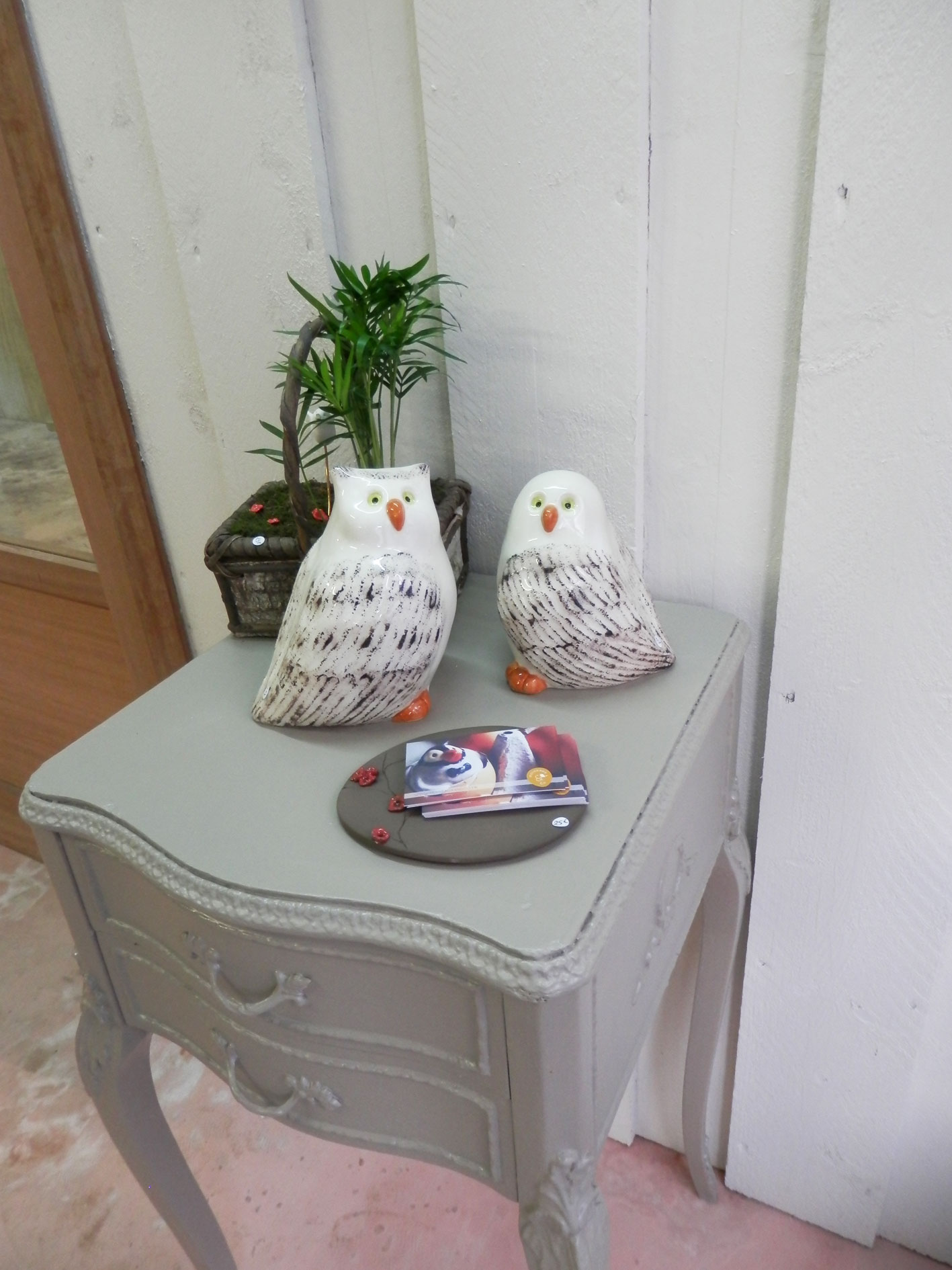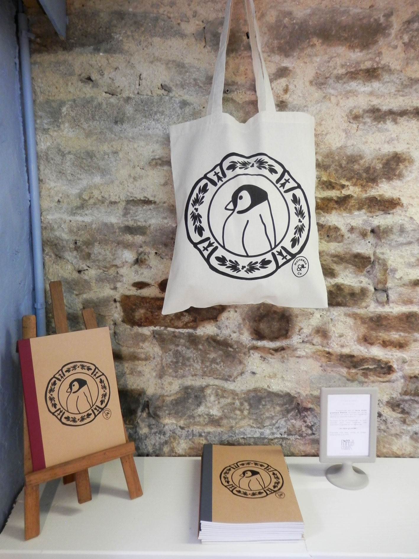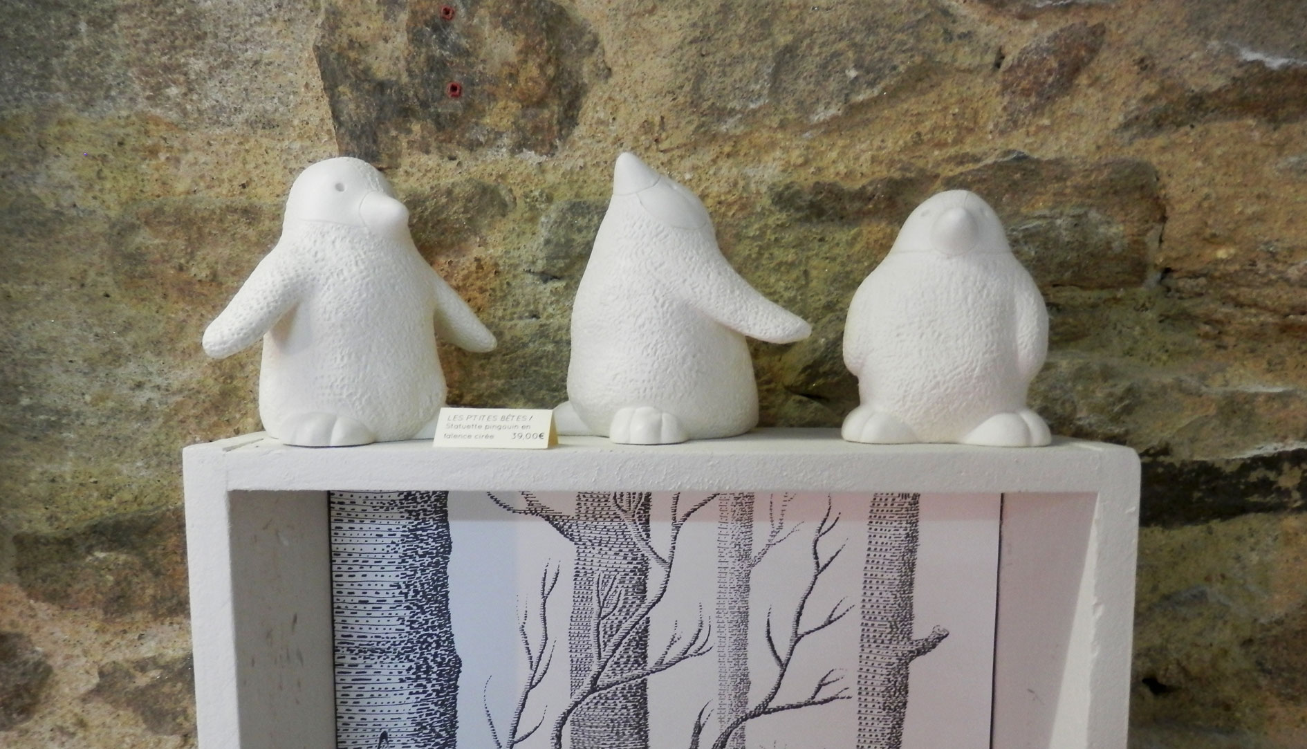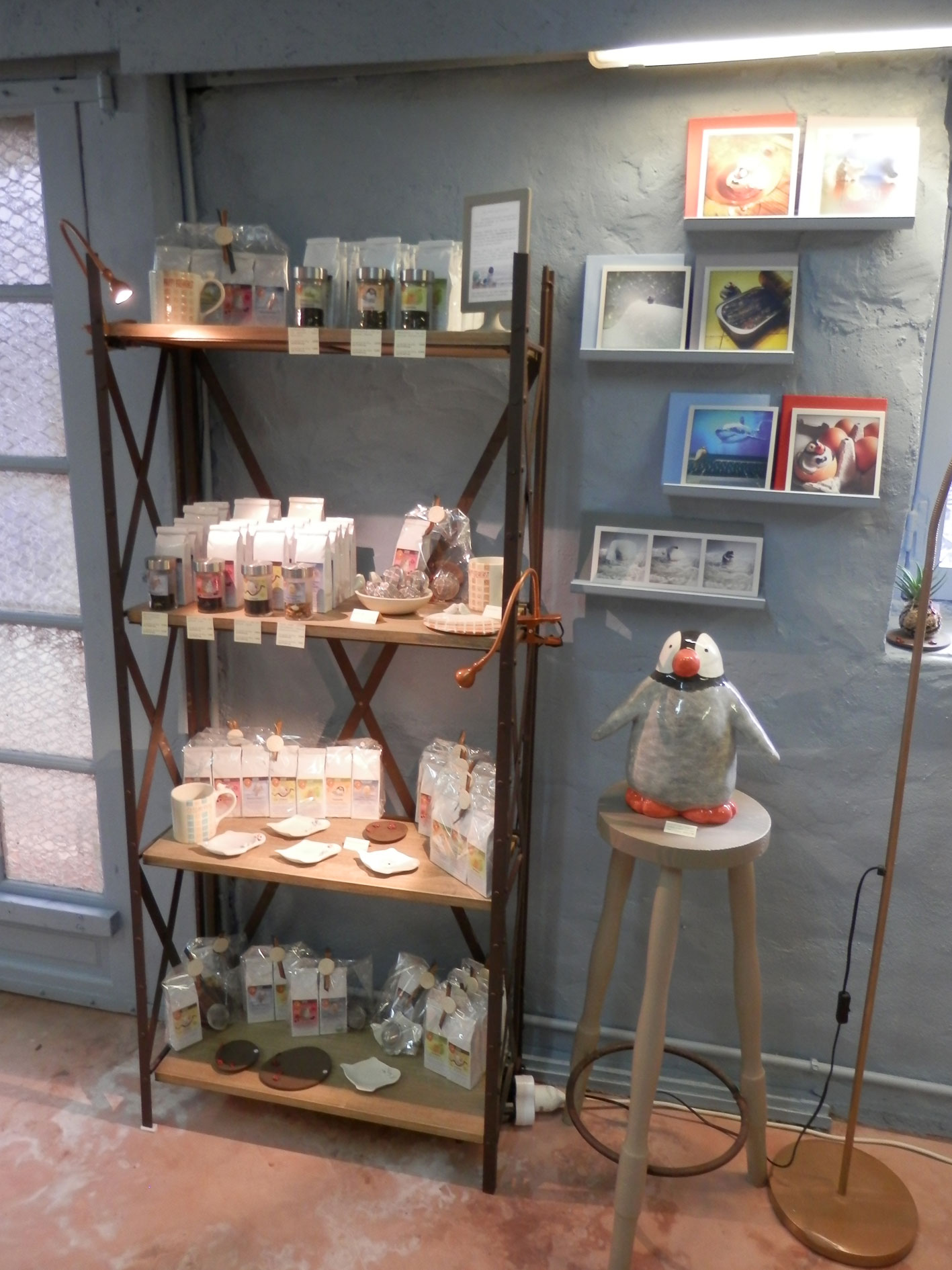 De gauche à droite : thés Moineaux & Co, cartes postales et sculpture pingouin (pièce unique).