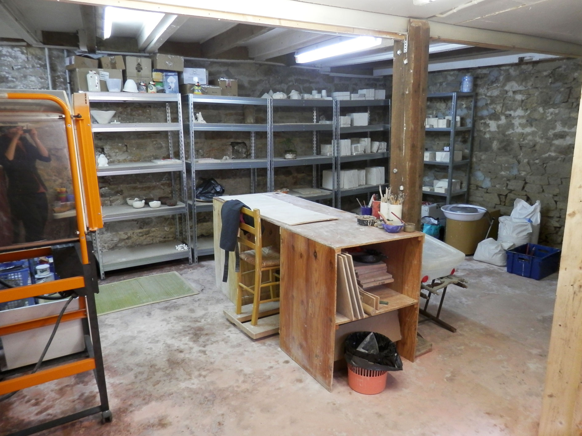 Voici l’espace de confection des céramiques : modelage, moulage, séchage. Le four est à gauche de la photo.