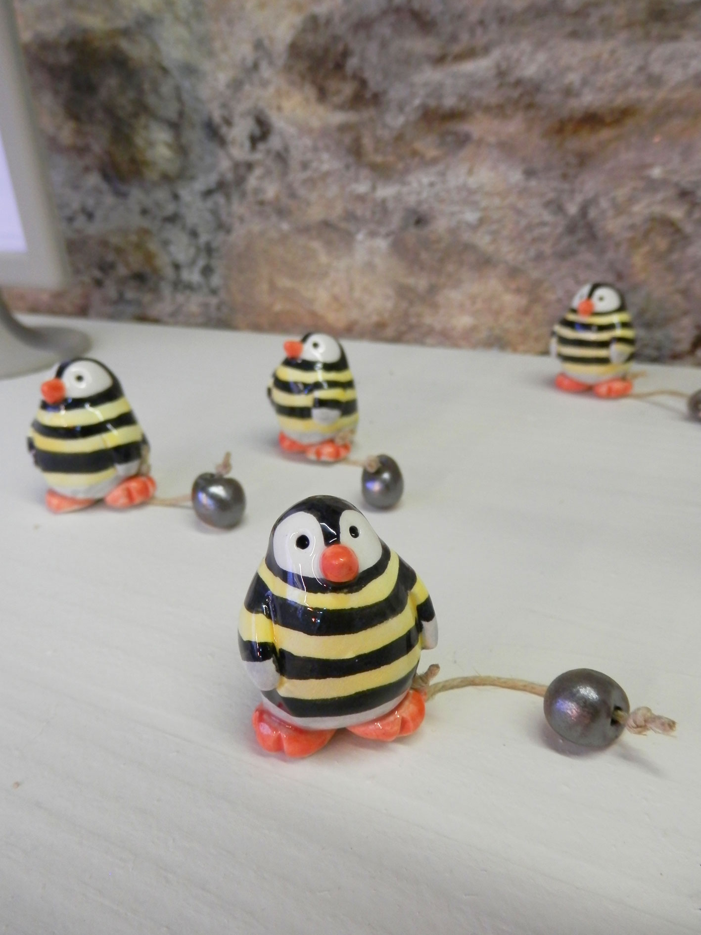 De gauche à droite : piques à plantes, nids garnis, Tiny houses, pingouins en faïence cirée, pingouins colorés et émaillés.