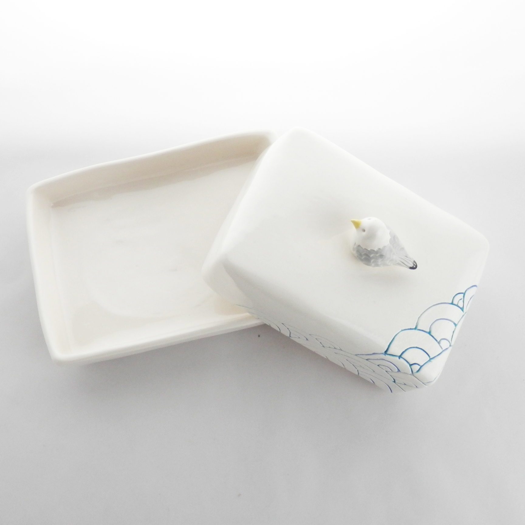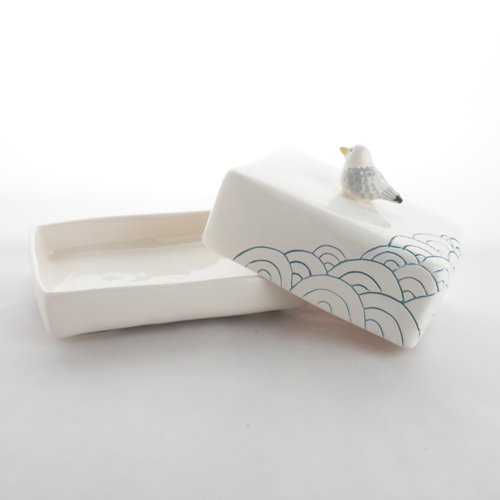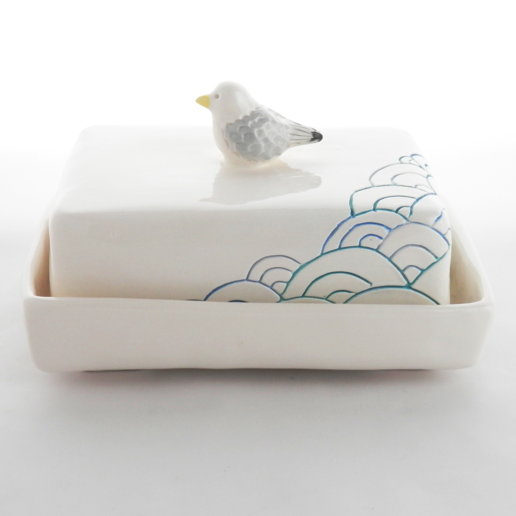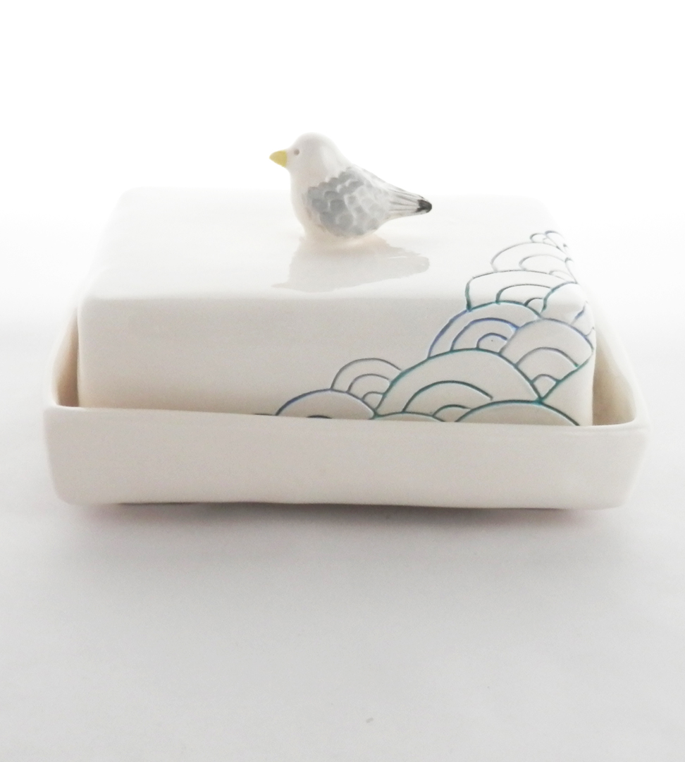 Ambiance marine pour ce joli beurrier avec un goéland sur le couvercle. Pratique, sa prise en main est en effet très aisée !