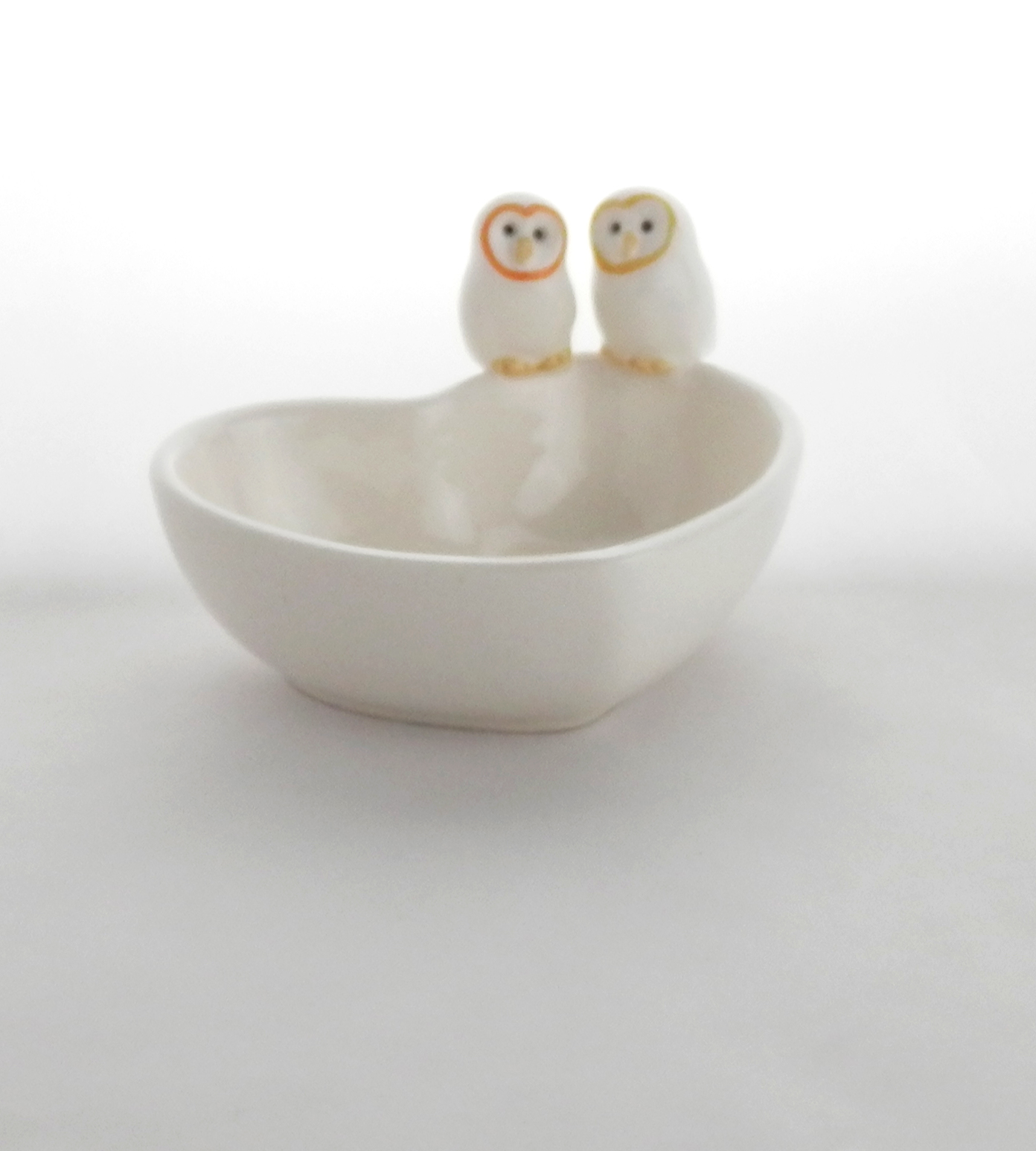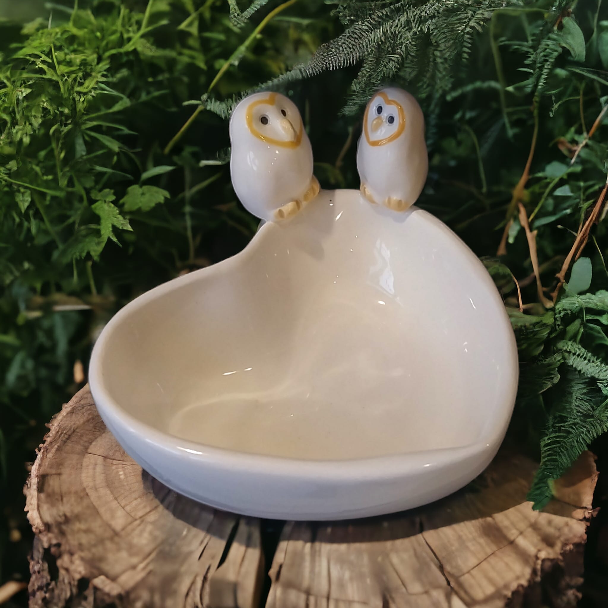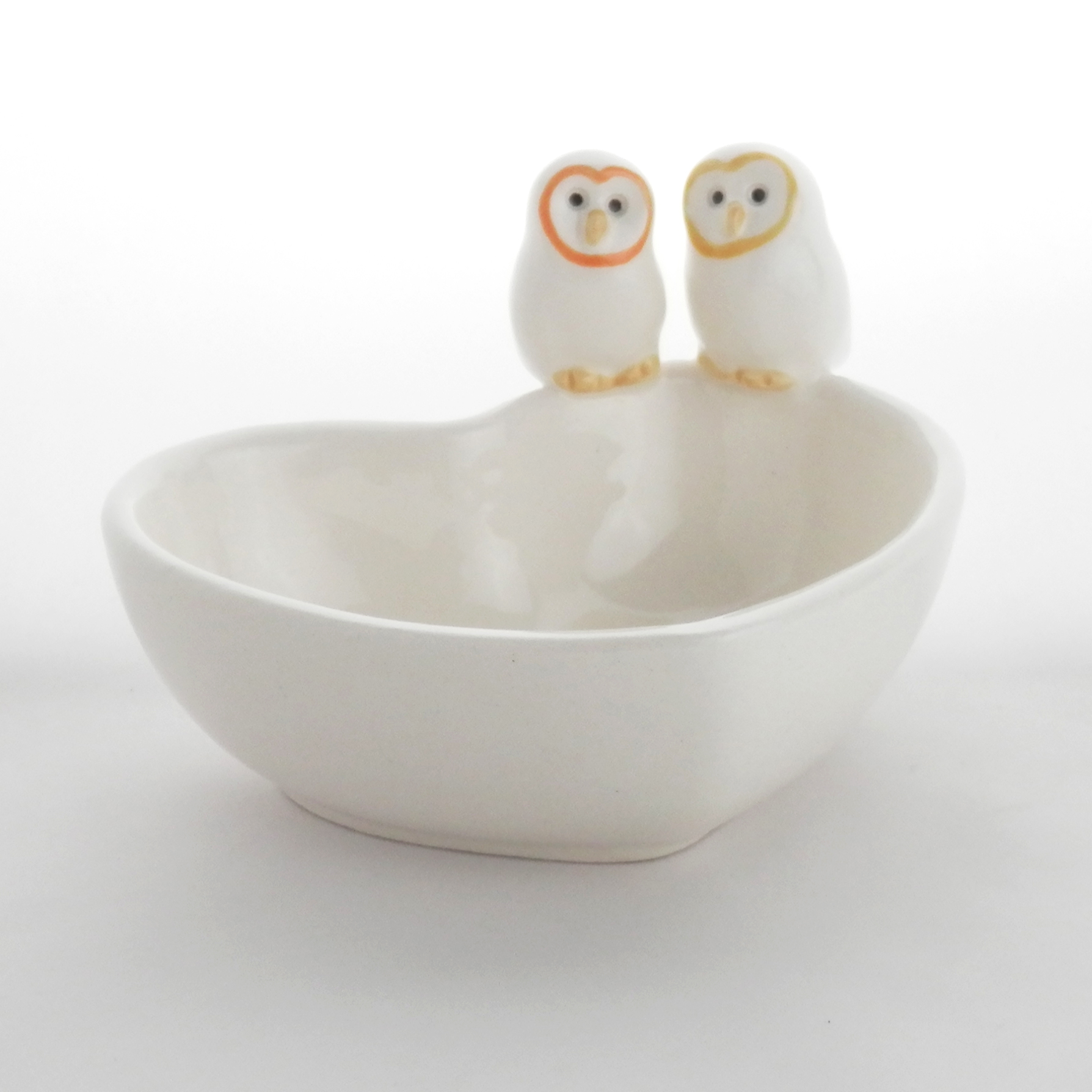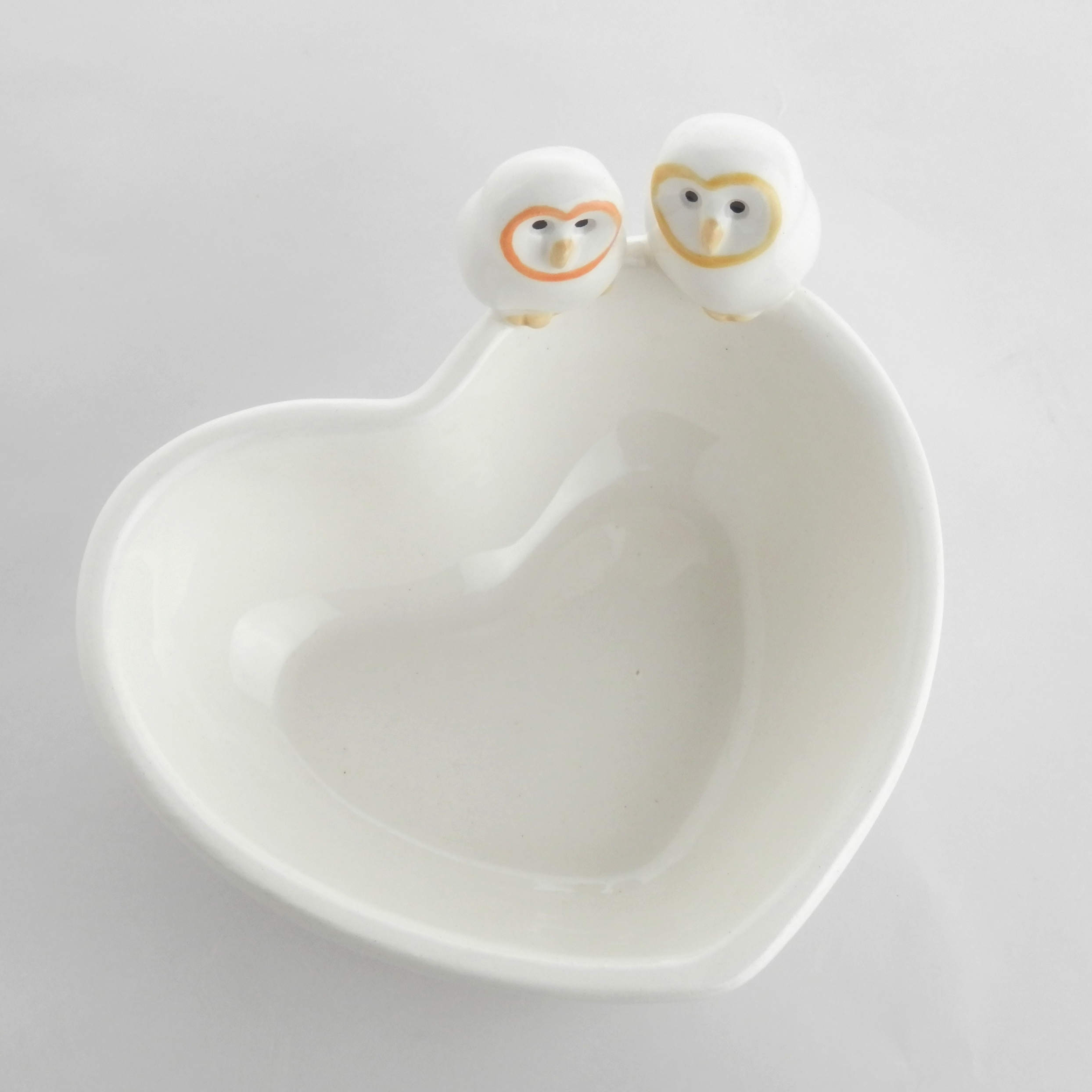 Une jolie coupelle en forme de cœur où vous pourrez déposer de petits objets (clés, papiers, savon…). Deux petites chouettes effraies seront les gardiennes de vos trésors et les couveront du regard en votre absence. Cette coupelle peut aussi être utilisée comme repose sachet de thé ou porte bijoux.