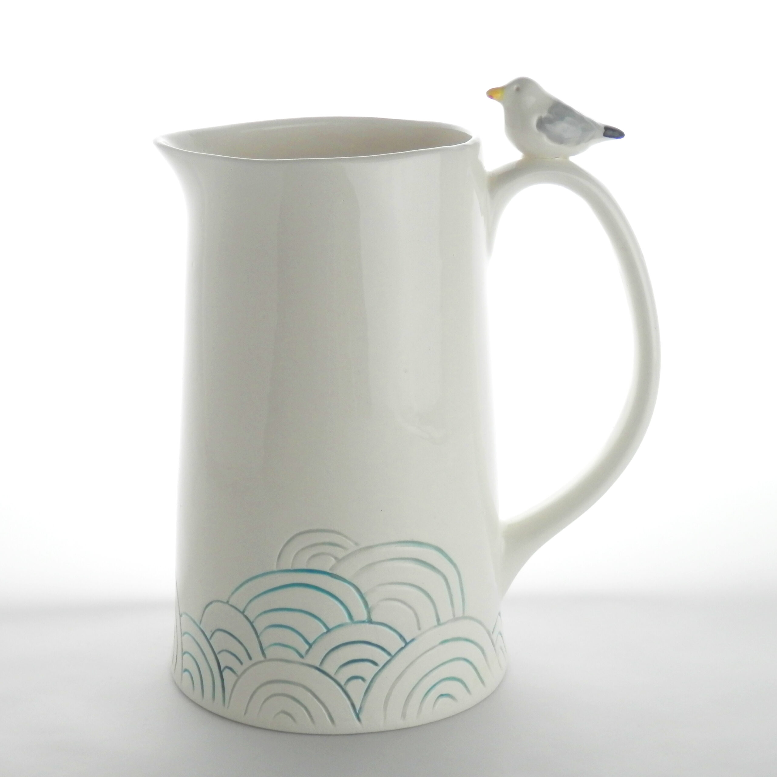 Ce pichet a été entièrement réalisé par mes soins dans mon atelier de fabrication de céramiques à Quimper. Les goélands sont entièrement modelés au creux de mes mains, ils sont donc uniques !
