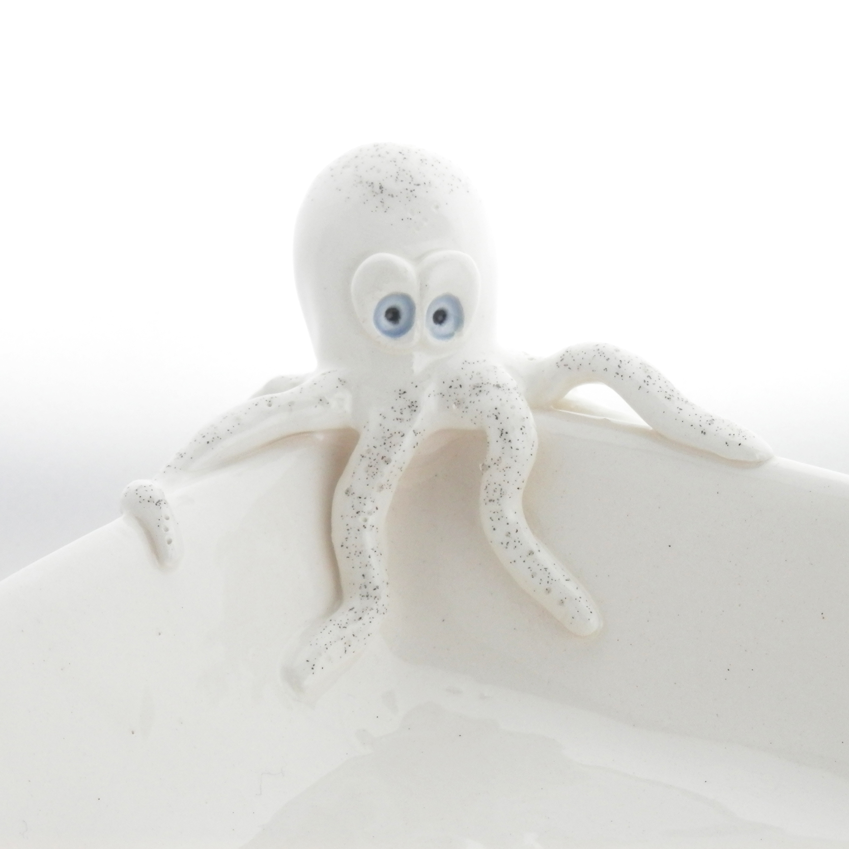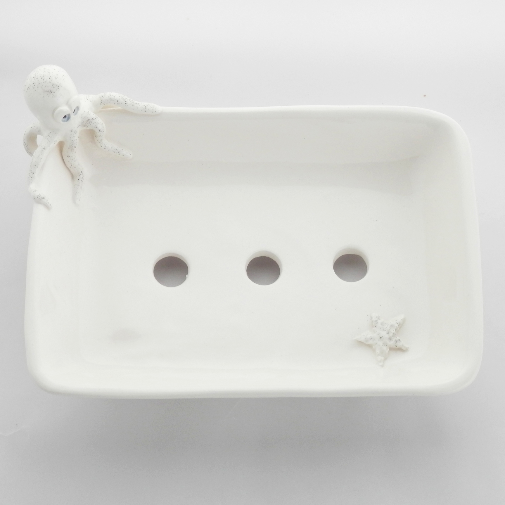 Un esprit marin avec ce joli porte-savon ! Un poulpe malicieux protège votre savon… Attention de ne pas vous faire attraper par ses tentacules ! Trois trous et quatre petits pieds permettent à l’eau de s’évacuer, et donc au savon de sécher !