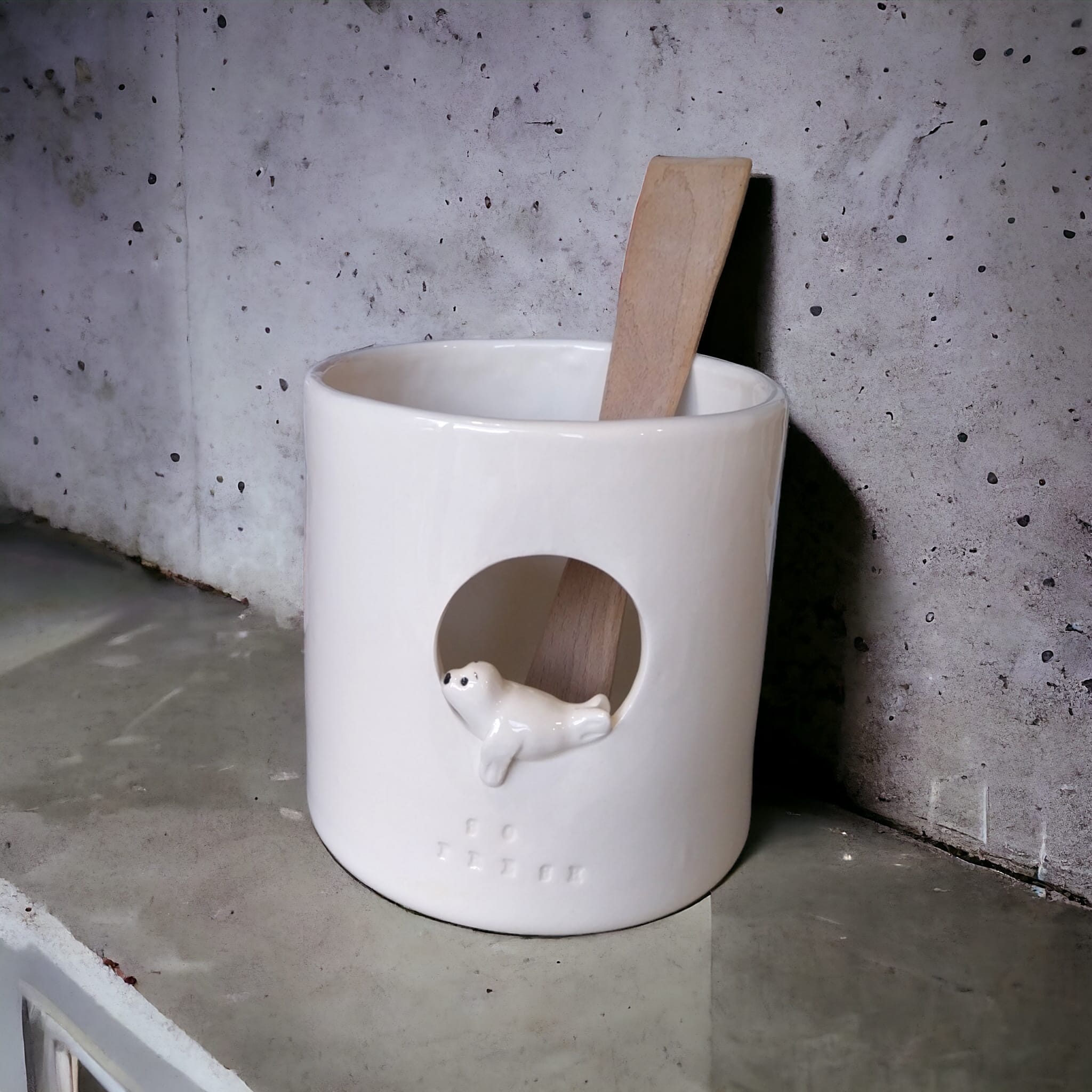 Un pot à ustensiles trop mignon avec ce petit phoque lové à l’intérieur ! Comme sur la banquise, il se prélasse… et attend avec impatience vos bons petits plats !