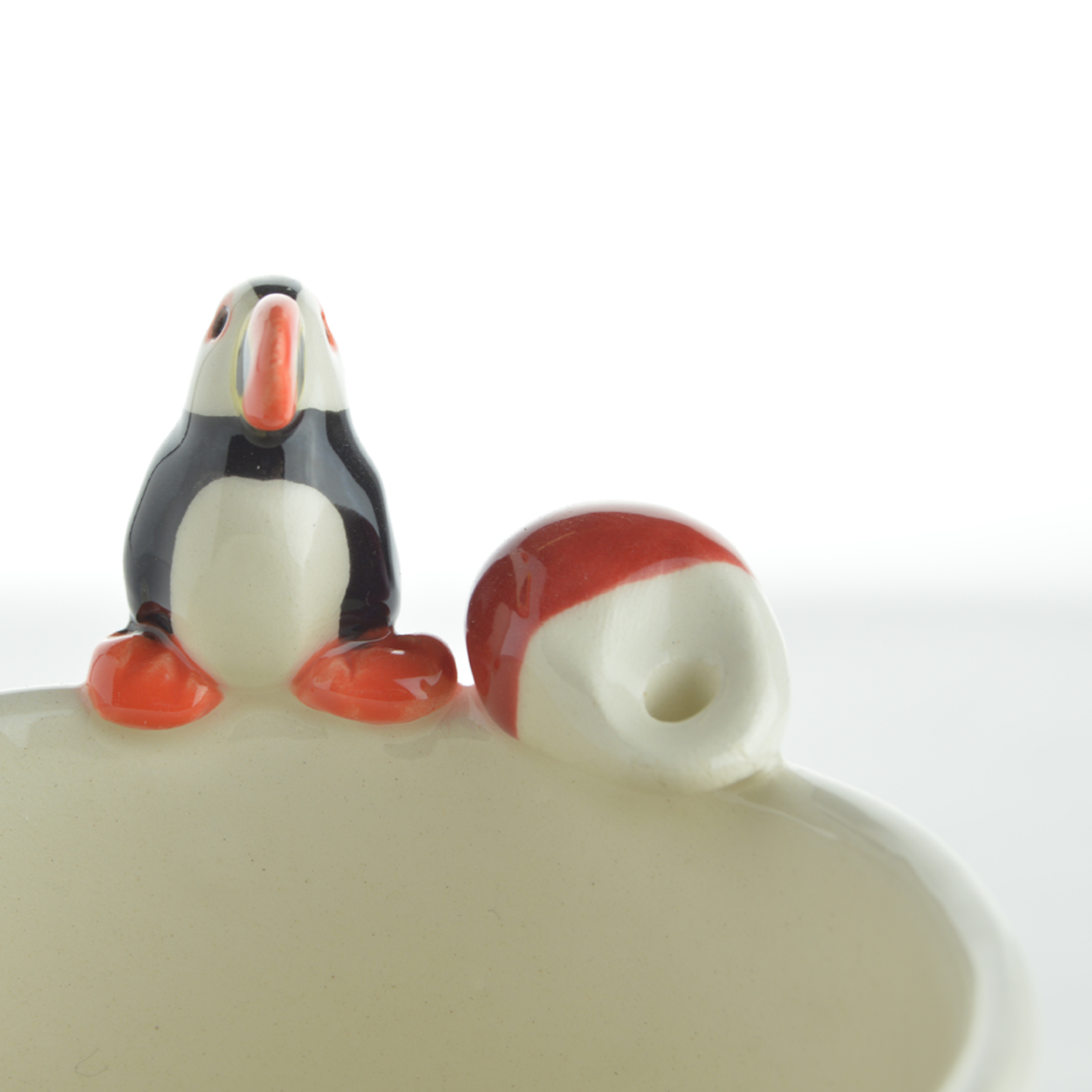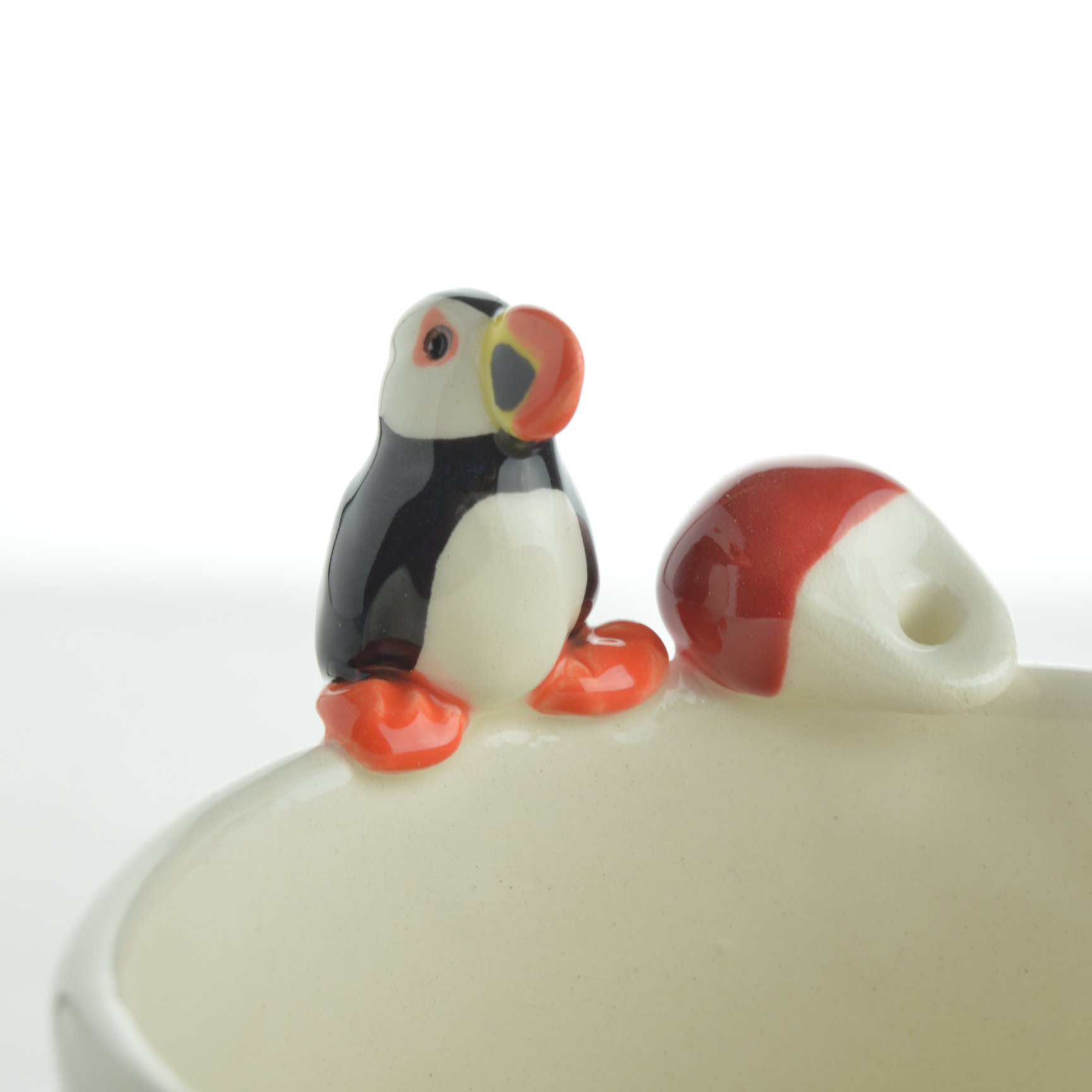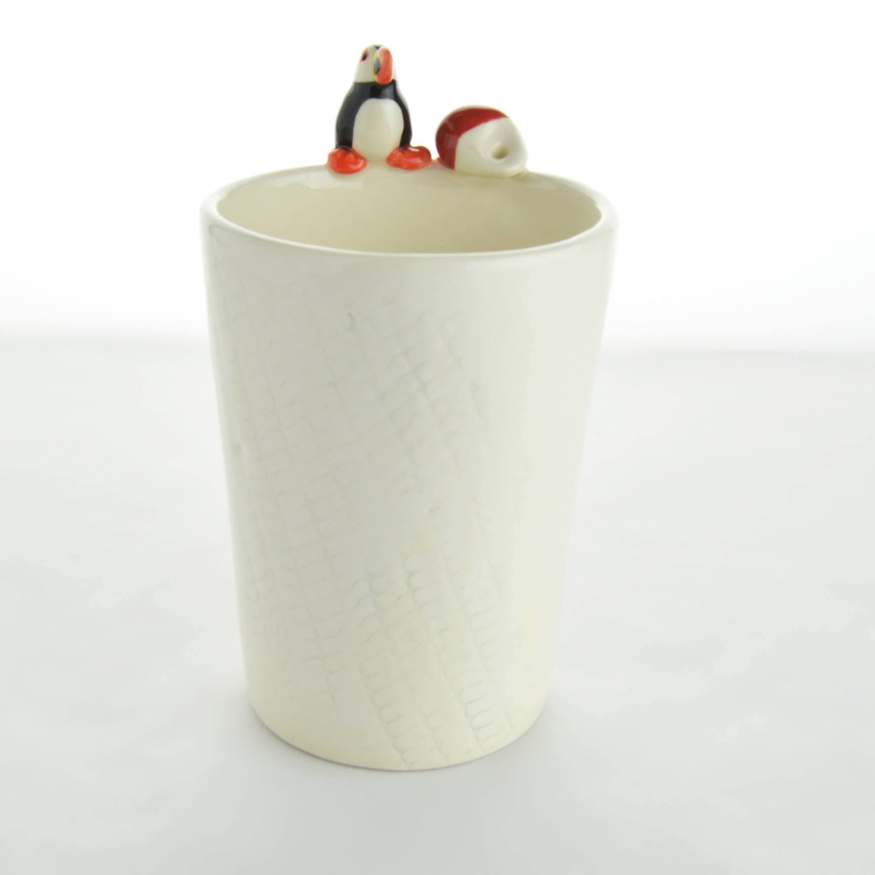 Un verre à brosses à dents dans un esprit bord de mer avec ce joli macareux moine qui se repose à côté d’une bouée.