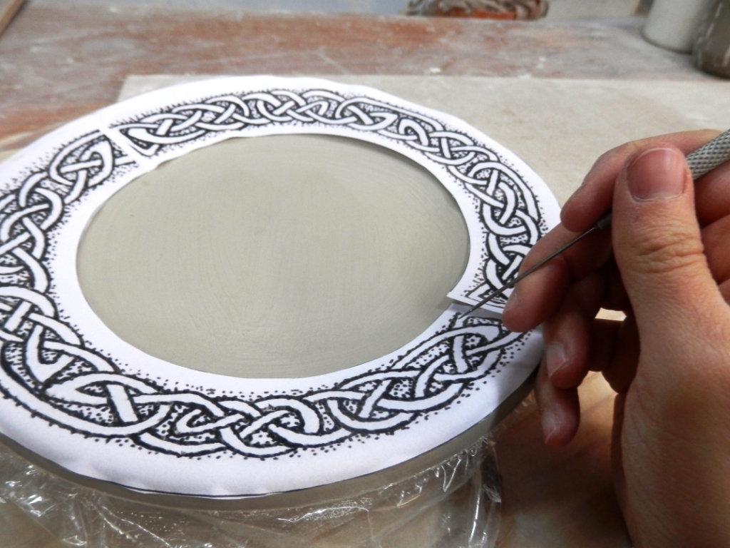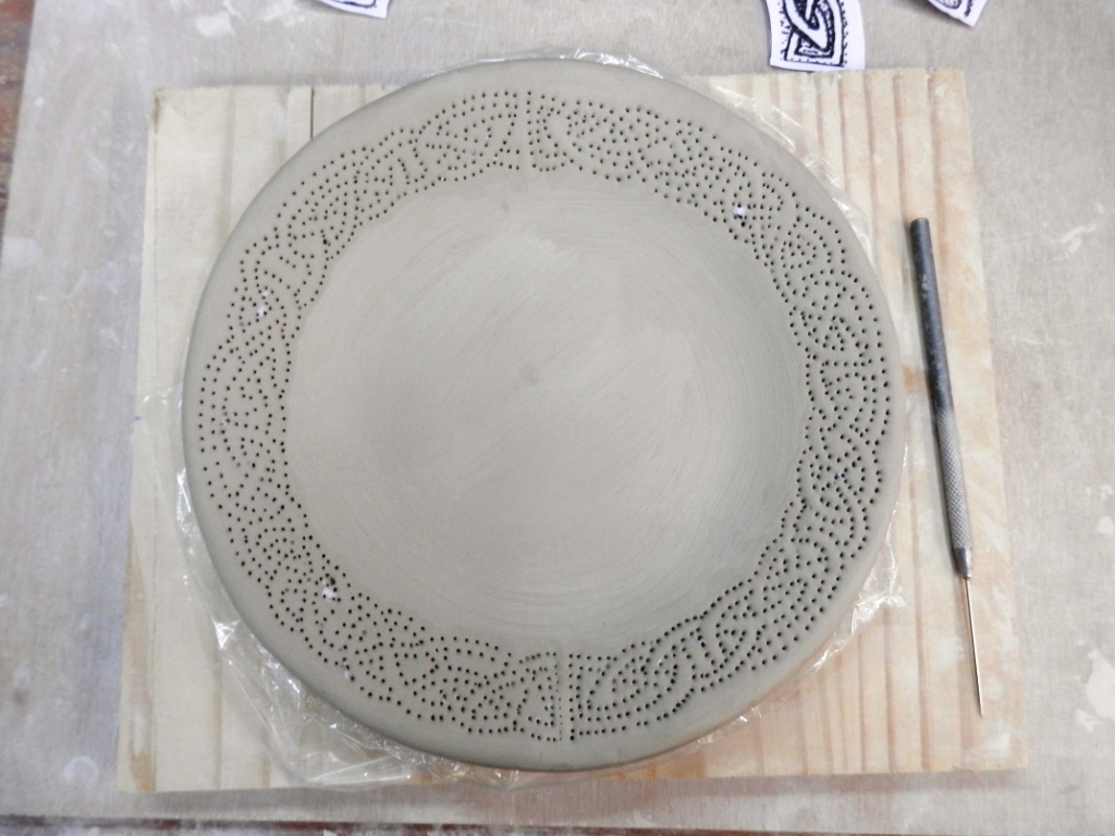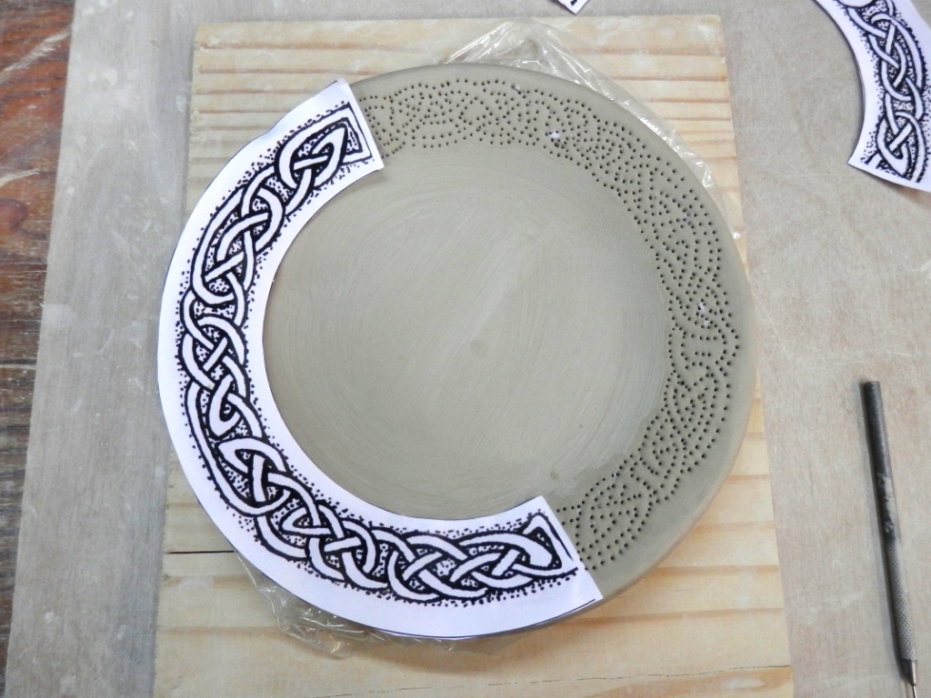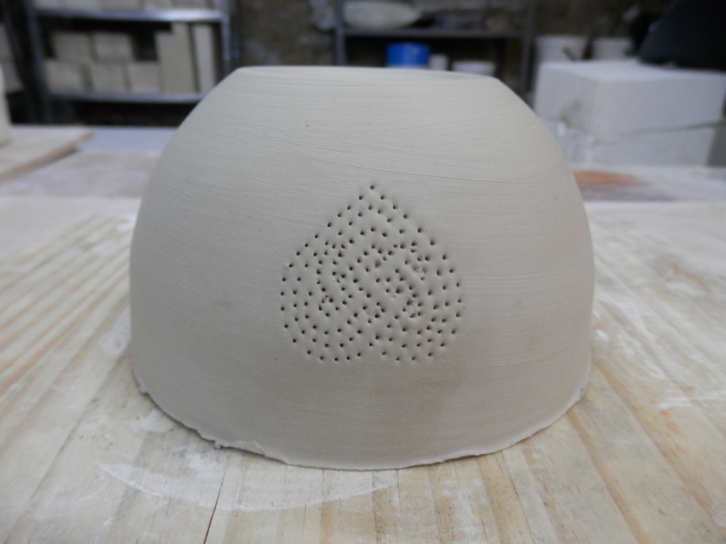 A l’aide d’une aiguille, je perce des petits trous à travers le papier pour imprimer le motif dans l’argile.