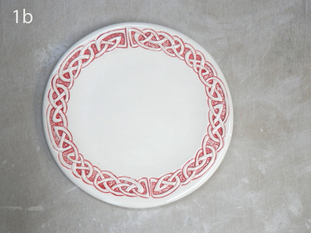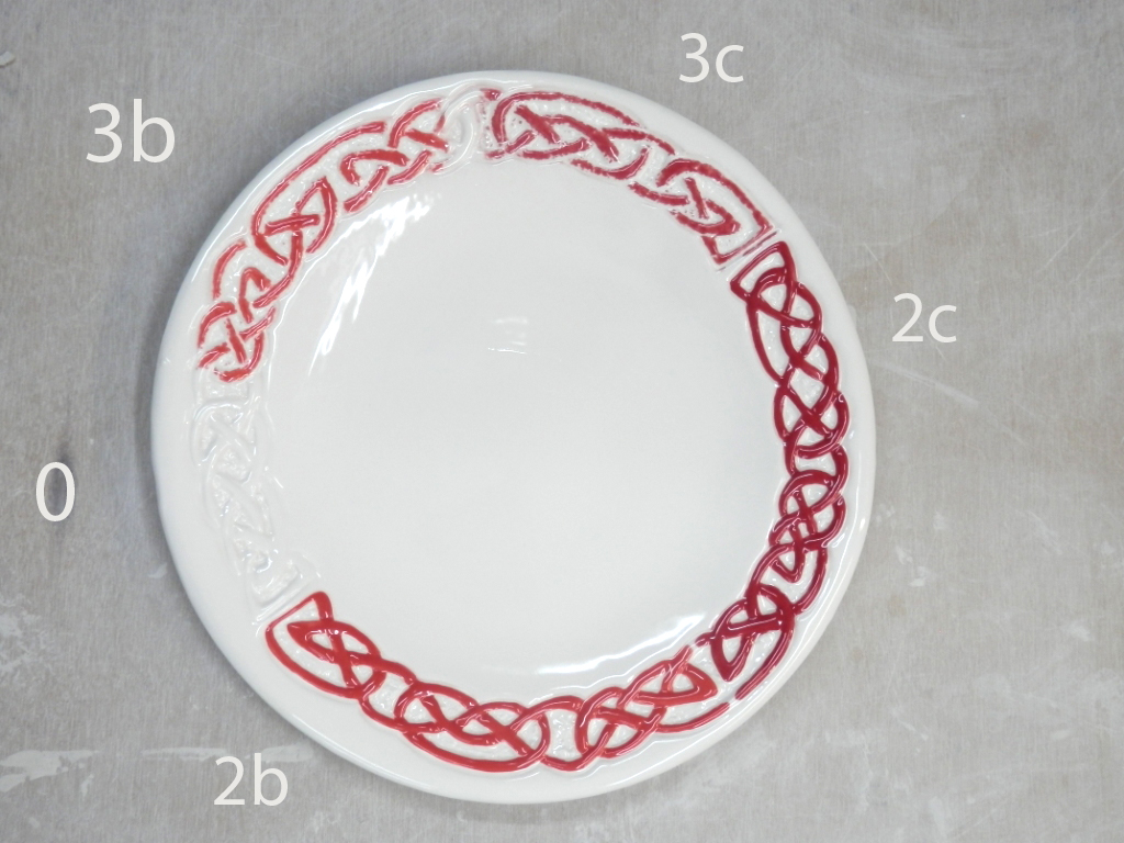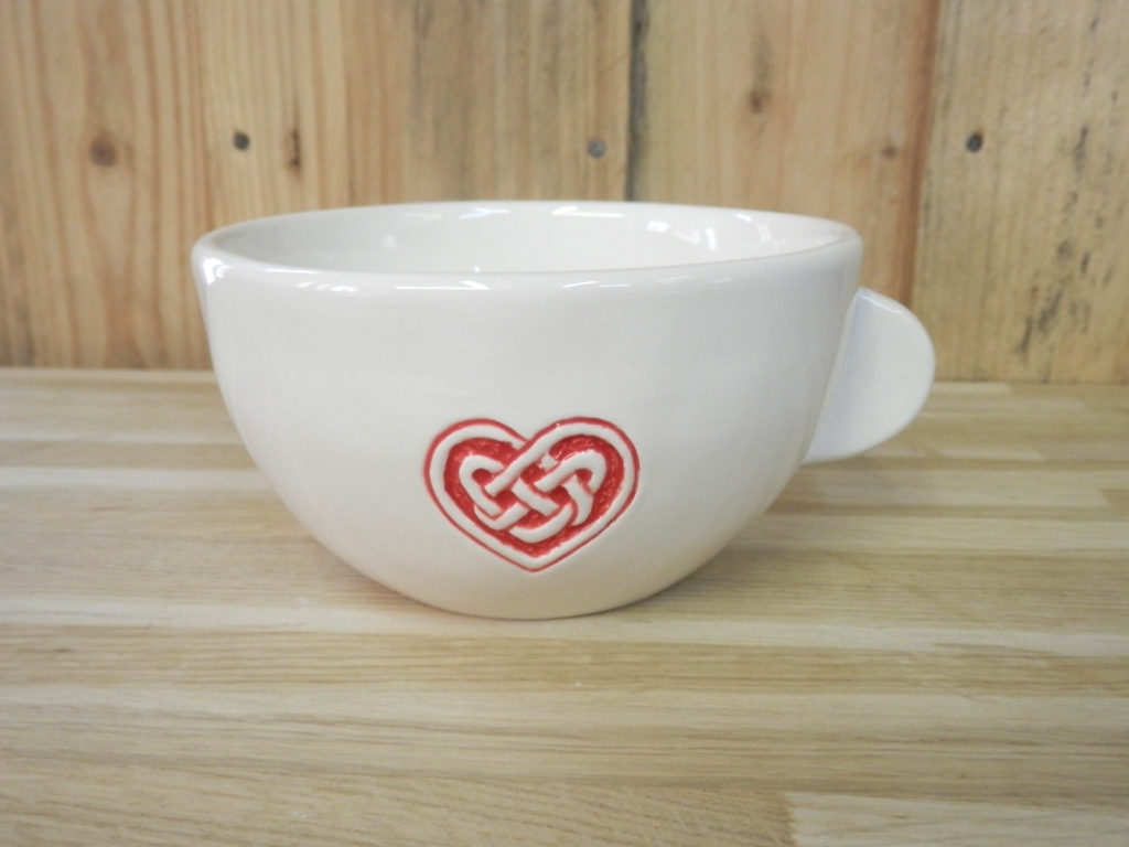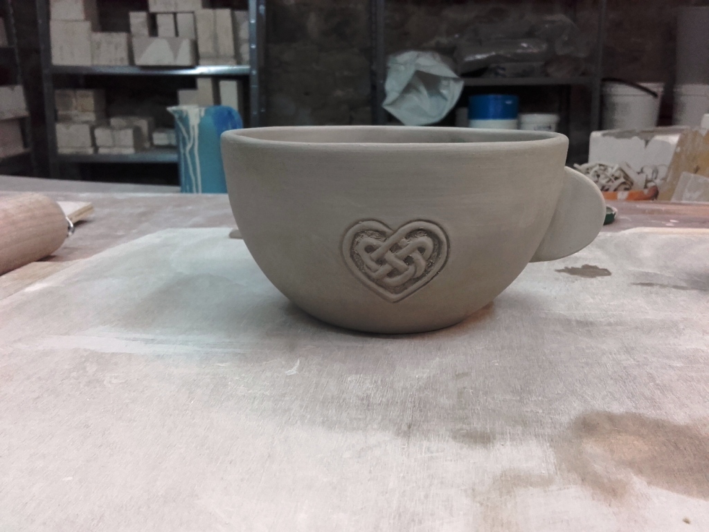 Suite à cette première sérié de 8 modèles, Françoise a eu une préférence pour la forme de tasse n°5 avec l’anse de la tasse n°8, une tasse toute en rondeur. Son choix s’est porté sur un décor d’entrelacs celtiques mais elle hésitait entre le bandeau de la 5 et le cœur de la 8. Au niveau des couleurs, pas de bleu, mais du rouge !