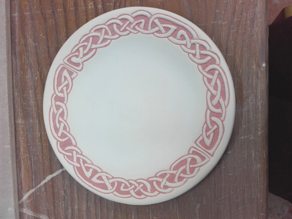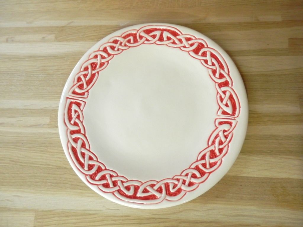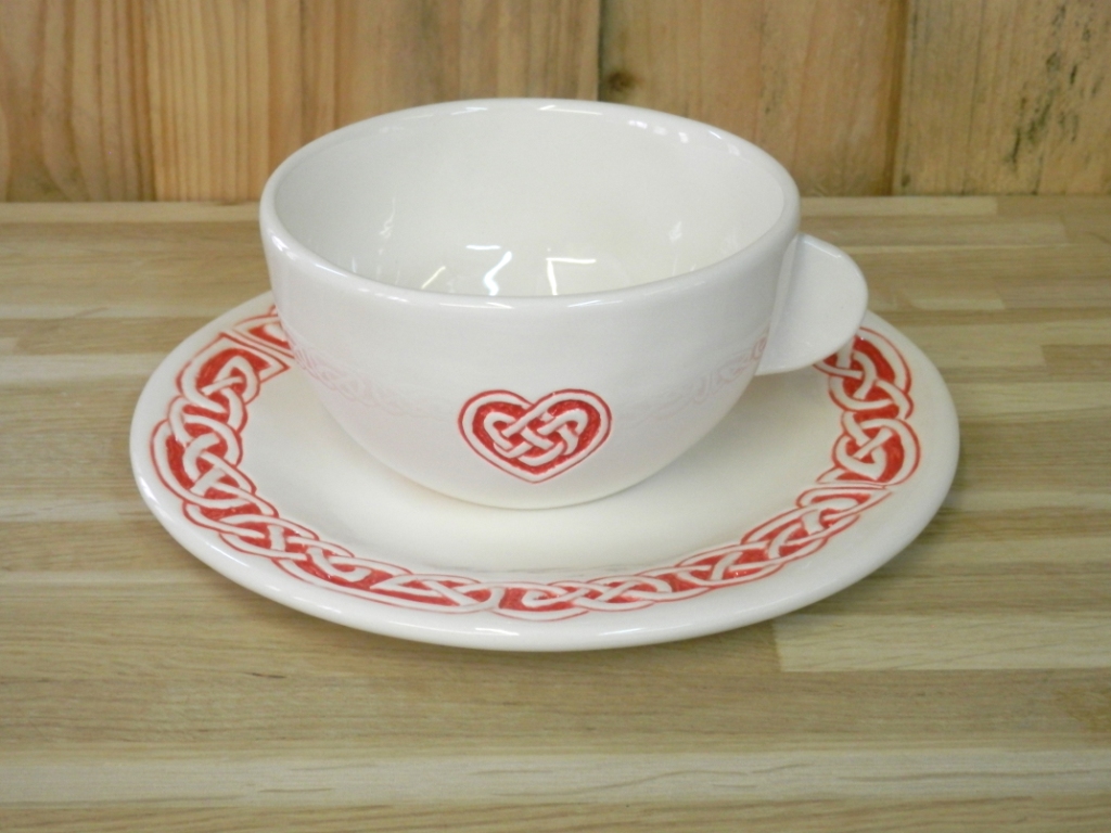 Suite à cette série, Françoise choisit de mixer les deux décors : la tasse n°7, toute simple et blanche avec le cœur celtique, et l’assiette assortie n°A avec le bandeau à entrelacs.