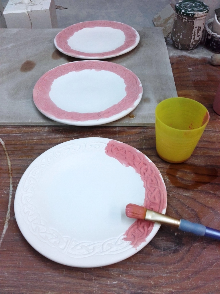C’est parti ! J’ai attaqué ensuite la peinture sur toutes les assiettes et tasses.